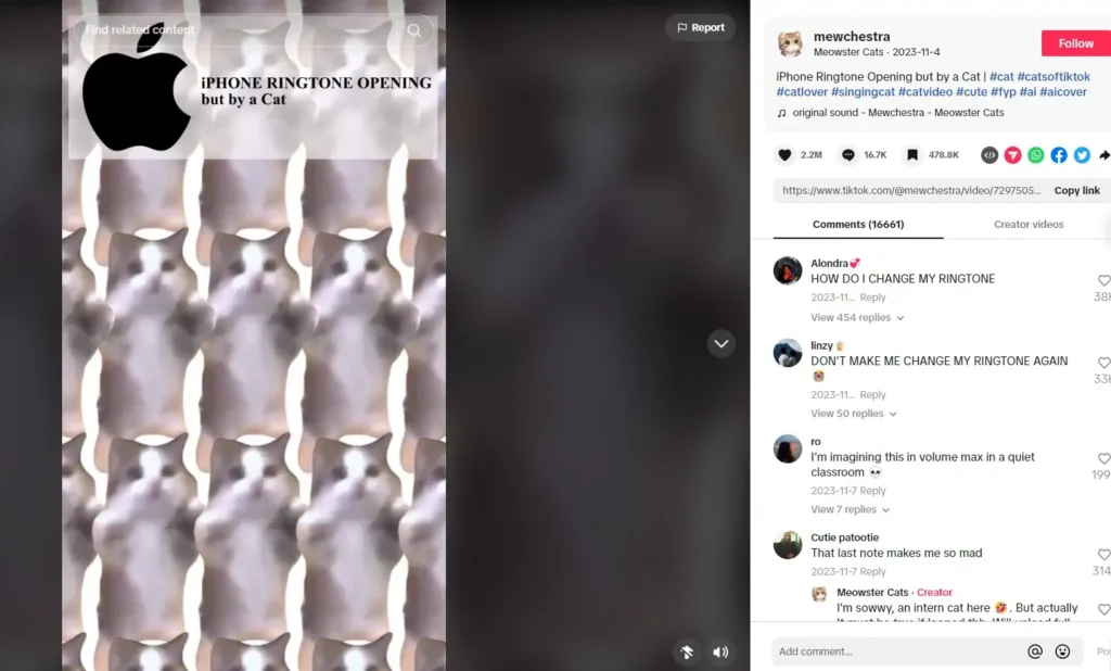 Les remix et les mashups de chansons populaires peuvent également ajouter une touche unique au contenu, le faisant ressortir, comme la sonnerie de l'iPhone remixée par un chat (https://www.tiktok.com/@mewchestra/video/7297505639448857874).
